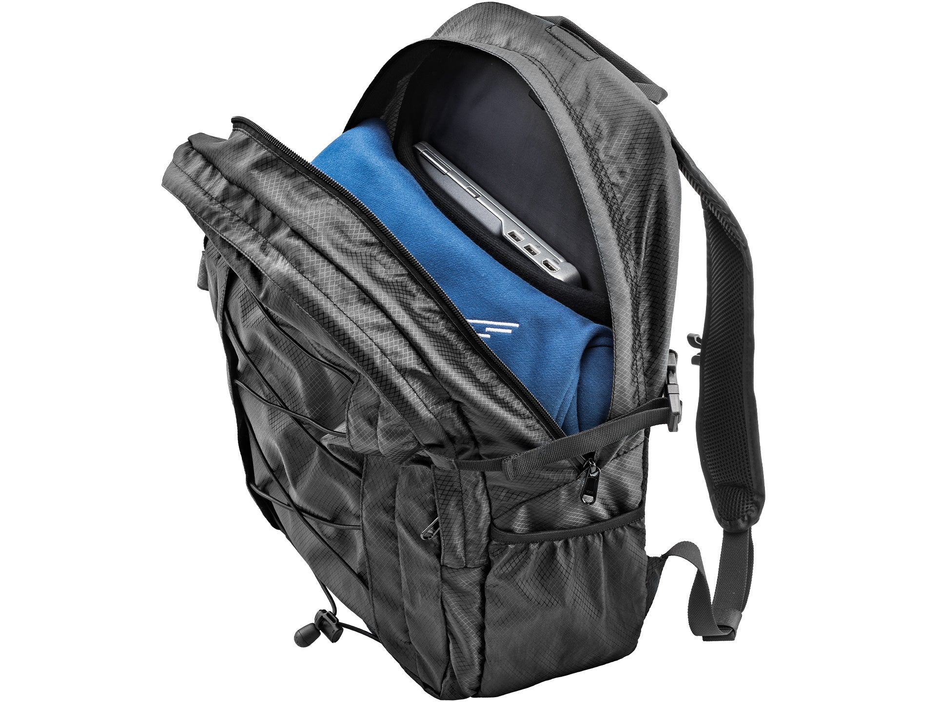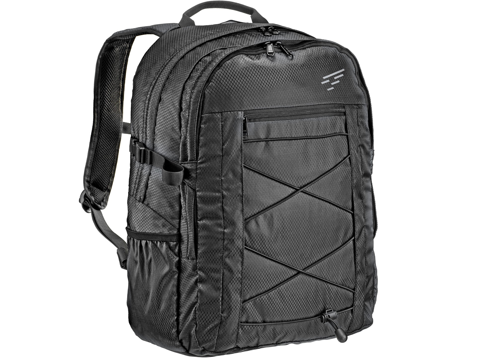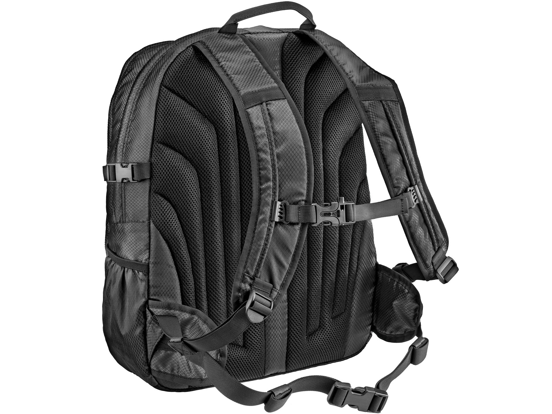 Completano lo zaino una cinghia sternale, una ventrale, spallacci sagomati ed imbottiti ed uno schienale con pannello imbottito dotato di canale per colonna vertebrale e strato in PE per un maggiore sostegno alla schiena. Inoltre, la trama a nido d’ape lo rende elegante ed indossabile con qualunque capo.